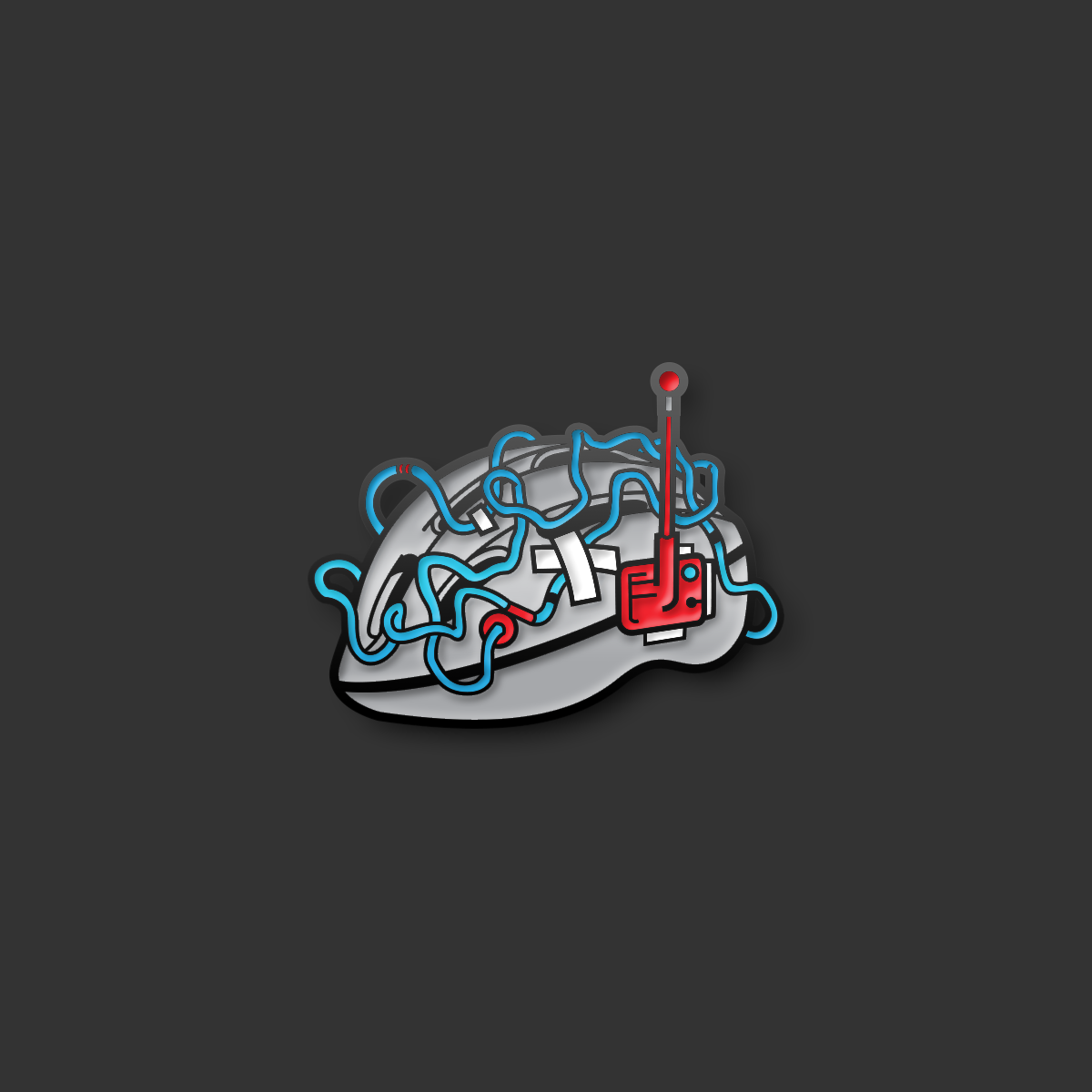 The device that started it all- the helmet connected to the almighty Mega64 system- is now at last immortalized in a beautiful, limited edition 1" enamel pin. Wear it and get ready for a real head trip!