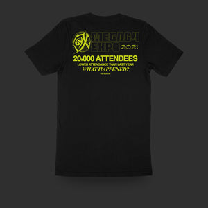 The official shirt of Mega64 Expo 2021- celebrating the event and asking a question of the universe (Seriously- we had over 64,000 attendees last year with no restrictions (on fun)... why did so many of them not return? Was there another event this weekend?). This black NextLevel tee is a 64X 2021 exclusive and will not be brought back after the event.