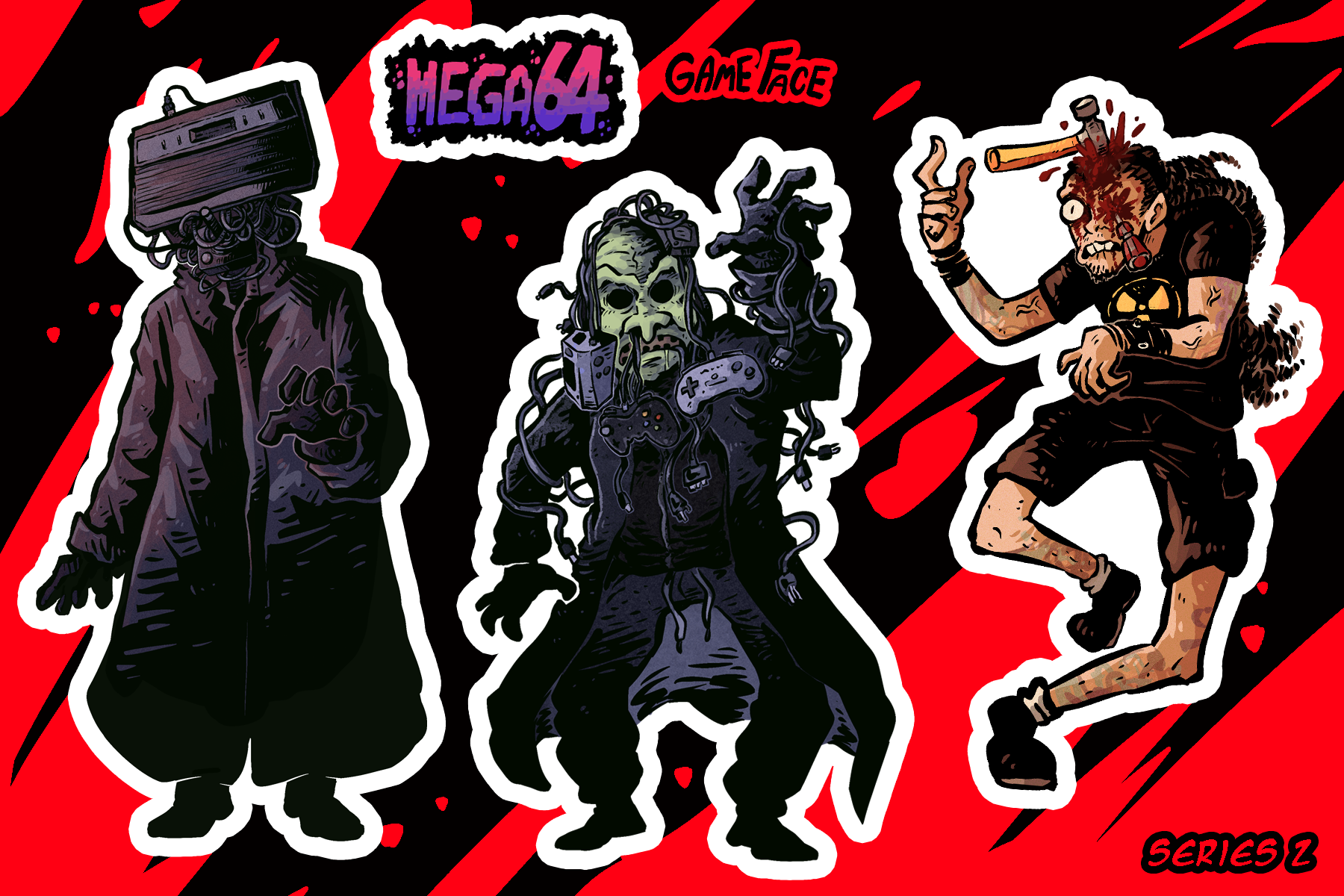An all new 4x6" pack of fun stickers to properly decorate your world in the most horrific sort of way. This second (of two) collection celebrates some of our most gruesome kills by the sinister Gameface, plus some other electronic accomplices...