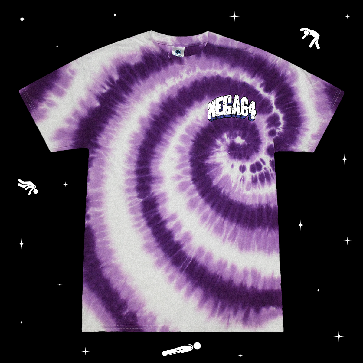 The Mega64 logo straight from the original Tricksters In Time arcade cabinet- featured boldly on a one-of-a-kind tie dye tee.