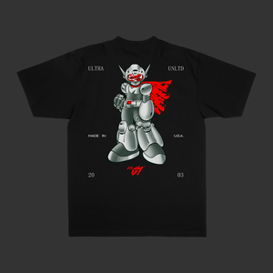 The ULTRA UNLIMITED Shirt with art by JEAUYCE - This message from the future, submitted to the past, stands strong in the face of evil. It also comes on a heavier black ShakaWear tee for maximum street wear quality!
